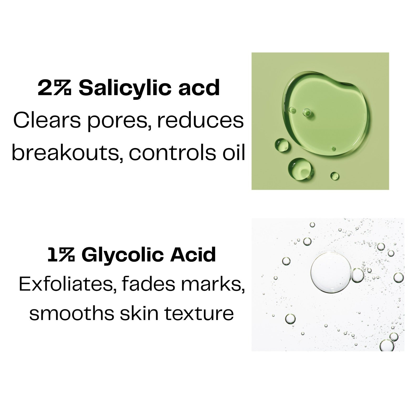 targets breakouts at every stage. Formulated with 2% Salicylic Acid, it penetrates deep into pores to clear congestion, reduce inflammation, and prevent future blemishes. The addition of 1% Glycolic Acid gently exfoliates the skin’s surface, helping to fade post-breakout marks, smooth rough texture, and promote a clearer, more even complexion. Lightweight yet effective, this treatment works to calm redness, refine pores, and keep skin looking fresh and balanced. Suitable for both targeted application and full-face use for acne-prone or congested skin.